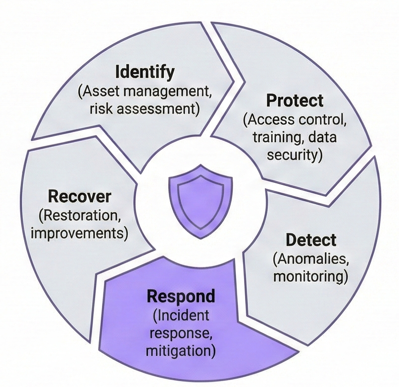 The NIST Cybersecurity Framework (CSF) 2.0 organizes security activities into six functions: Govern, Identify, Protect, Detect, Respond, and Recover. This addition of “Govern” emphasizes that cybersecurity is a corporate leadership responsibility, not just a technical one. This framework works for organizations of all sizes and industries because it focuses on outcomes rather than prescribing specific technologies.