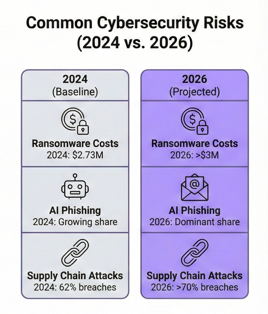 Your organization faces threats that barely existed three years ago. AI-generated phishing now makes up a large share of attacks and achieves significantly higher click and compromise rates than traditional email scams, making it far harder for employees to spot malicious messages. Cloud misconfigurations and exposed secrets are now a leading cause of data exposure, with many cloud environments running publicly reachable workloads or storage that contain sensitive data. Meanwhile, modern DDoS campaigns can degrade or take down critical services within minutes if you lack layered monitoring and mitigation controls, directly impacting revenue and operations.